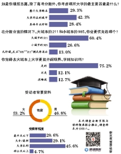 眼下,高考填报志愿时间已经开启。北上广等大城市的211和小城市的985,哪个更值得选?也在网上引发热议。你对此怎么看?本期“京报调查”(新京报与清研智库联合推出)就此展开调查。