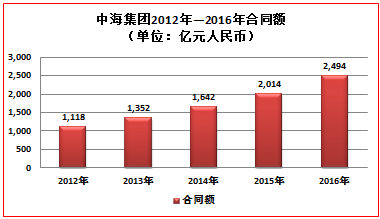 20年来,中海集团主营业务迅速强劲的增长,也助推了母公司中国建筑的蓬勃发展。2009年中建股份上市后,先后以增资委贷方式支持中海集团共计100亿人民币,有力支持了中海集团的业务扩张和业绩增长。中海集团在国资委和母公司中国建筑的领导和支持下,实现了快速高质增长,同时也为总公司,特别是中建股份A股成功整体上市做出了积极贡献。中海集团在中建总公司的正确领导和大力支持下,近五年取得了较好的经营业绩。2012-2016年,中海集团主营业务工程承包及房地产业务均实现持续增长,年复合增长率为22.2%,其中于2015年首次实现合同额跨越两千亿元台阶,达到2014亿元。2016年,集团完成合同额2494亿元,较2012年合同额增长1376亿元,增长了1.23倍,其中房地产合同额为1780亿元,实现历史新高。
