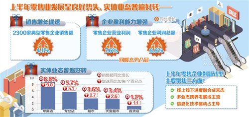 商务部流通业发展司负责人表示,今年上半年我国零售业发展呈现以下特点:行业销售增长提速。2300家典型零售企业销售额同比增长4.1%。企业盈利能力增强。零售企业营业利润和利润总额同比分别增长7.6%和6.6%,较去年同期分别提高7.8个和14.3个百分点,回暖态势凸显。实体业态普遍好转。专卖店、专业店、超市、大型超市、百货店销售额同比分别增长8.8%、5.7%、3.6%、3.4%、1.2%。企业开店意愿增强。零售企业积极制订开店计划,同时兼顾老店改造,大力推行“实体+互联网”融合发展模式。