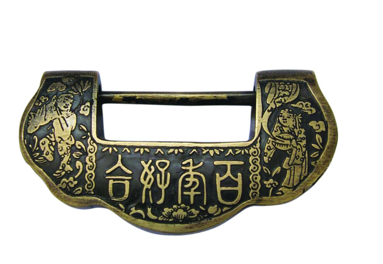 锁,我们常见的一种器物?!洞窃础吩唬骸八盼街?,今谓之锁?!贝笤际且蛭难鲜敌裕湃顺私迷诒9芪锲飞?,还引申为祝福和爱情之意。古锁的文化内涵,为本来坚硬的金属增添吉祥如意的民俗色彩。新娘出嫁时,在嫁妆箱上用“十二生肖”锁,脖子上要挂上吉祥锁;寿宴时用“福禄寿喜”锁;小孩过生日就会用长命锁;流传最广且最具有震撼力的莫过于黄山莲花峰上的“连心锁”了,可谓是“情比金坚”最美好的祝愿。