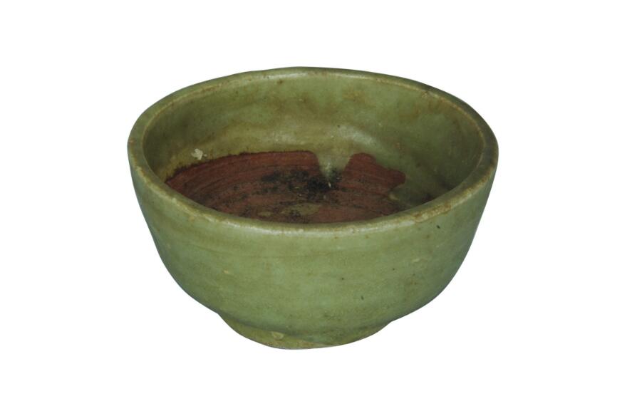 五代龙泉窑青釉碗(图1),口径8.3厘米,底径4厘米,高4.5厘米。敛口,斜直腹,圈足,碗外壁通体施青釉,内部施釉不及底,底不施釉。腹底有三足。