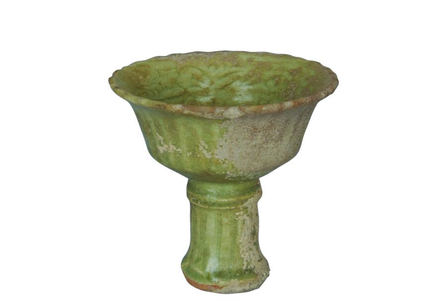 元龙泉窑影青釉高足碗(图3),口径13厘米,底径4.7厘米,高12.5厘米;花口,折腹,平底,高圈足;碗内壁饰缠枝花卉纹,外壁饰莲瓣纹;足呈竹节状,内外施影青釉。