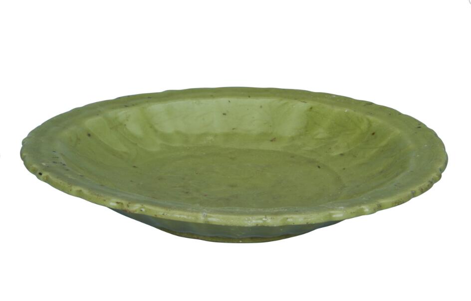 清龙泉窑青釉暗花纹盘(图5),口径31.6厘米,底径15厘米,高5.2厘米;敞口,菱花形折沿内凹,口沿饰双线水波纹一周,弧壁作扇骨状。内壁饰一圈缠枝花卉纹。整器施青釉。