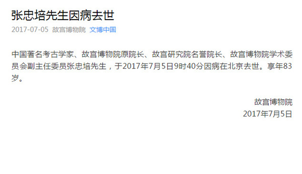 据故宫博物院官方网站消息,中国著名考古学家、故宫博物院原院长、故宫研究院名誉院长、故宫博物院学术委员会副主任委员张忠培先生于2017年7月5日9时40分因病在北京逝世。享年83岁。
