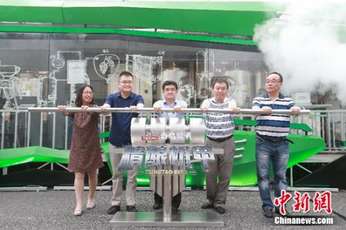 中新网7月3日电 盛夏季节,啤酒不可或缺。其中精酿啤酒以其小众与个性而获得部分啤酒客青睐。7月1日,由青岛啤酒打造的一辆精酿机甲现身上海国际时尚中心,青岛啤酒公司制造副总裁、中国酿酒大师董建军参与投料生产,启动了青岛啤酒精酿机甲的全国巡回酿造之旅。