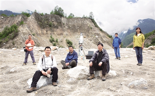 中国科学院成都山地所的科研人员杨宗佶副研究员、陈晓清副所长、柳金峰副研究员、游勇总工程师、李战鲁工程师、李秀珍副研究员(从左至右)。 新华社记者 金立旺摄