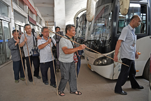 客运站一工作人员(右一)牵引盲人曲艺队队员登上长途汽车 万象/摄