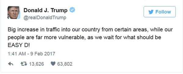 正如网友所说,特朗普并不是第一次犯此类错误,2月8日,特朗普发推文对此前发布的"限穆令"做出辩护,并再次对阻止这项禁令的美国司法机构做出抨击,他写到:"在我们等待一项本来应该是"EASY D"的期间,从某些地区进入我们国家的人数大大增加,但我们的人民却是非常脆弱的。"据美国在线俚语词典"城市字典"的解释,该词是"淫妇"的意思。