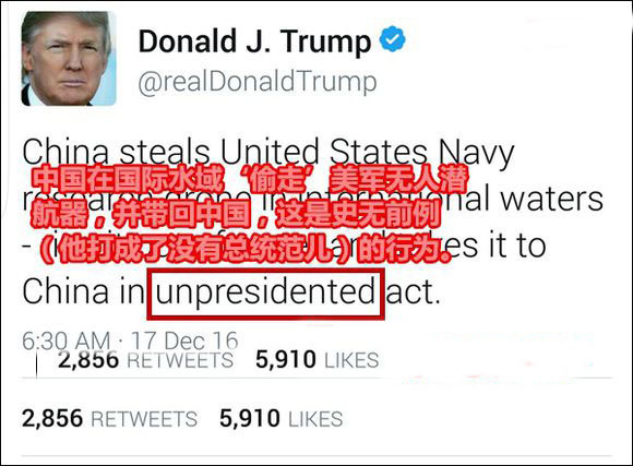 当地时间16日早上6点半,美国总统当选人特朗普对中国在南海捕获美国无人潜航器一事,发布推特抨击中国。但是在推特中,他将"史无前例"一词错误拼写为"没有总统范儿"一词。(编译/海外网 吴潇)