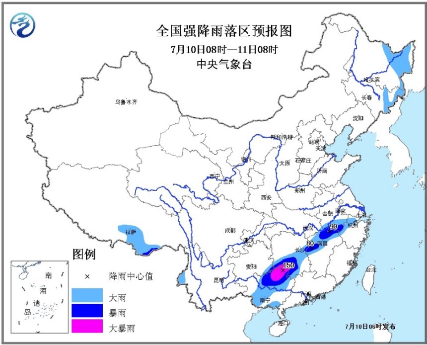 人民网北京7月10日电 据中央气象台网站消息,中央气象台7月10日06时发布暴雨蓝色预警:预计,7月10日08时至11日08时,安徽南部、浙江西北部、江西北部、湖南中南部、广西中东部、云南西部以及吉林东部、黑龙江东部、西藏东南部等地的部分地区有大雨或暴雨,其中,湖南西南部、广西东北部等地局地有大暴雨(100~150毫米);上述部分地区有短时强降水,局地伴有雷暴大风等强对流天气,最大小时雨强可达20~40毫米,局地超过50毫米。