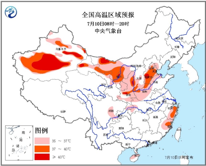 中央气象台7月10日06时继续发布高温黄色预警:预计,7月10日白天,华北中南部、黄淮西部、西北地区东部、内蒙古西部、甘肃北部、新疆北疆南部和南疆盆地、四川盆地西部、重庆北部以及浙江、福建、海南等地有35℃以上的高温天气,其中,河北中南部、内蒙古西部、甘肃北部、宁夏中北部、山西西南部、陕西关中地区、浙江东部、福建东部以及新疆南疆盆地等地的部分地区最高气温可达37~39℃,局地可超过40℃。