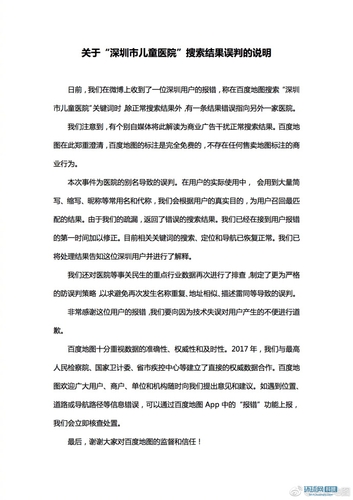 百度地图关于“深圳市儿童医院”搜索结果误判的说明