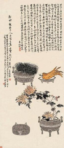 吴昌硕 西汉喻陶陵鼎拓本(补花果长题轴) 137×59.5cm 1902年 西泠印社藏
