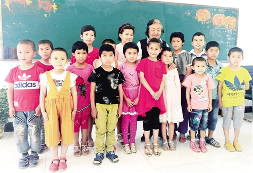 潘玉莲老人和孩子们在教室里合影。乔文汇摄
