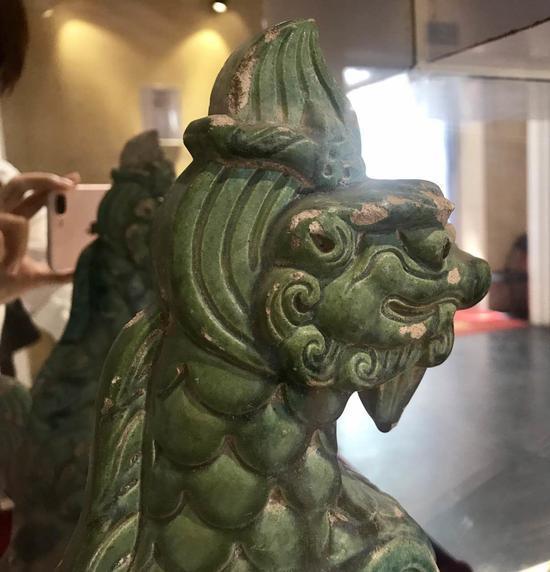 这次展览中,最为引人注目的展品是一尊鎏金铜象首。这是2014年考古队在发掘大宫门河道周边文物时,于河底淤泥中无意发现的。当这个泥疙瘩被送进实验室,经半个月清洗后,才露出了自己的“真容”。象首上有长而卷的鼻子、长牙、大耳,制作工艺考究,整体造型精巧,线条流畅自然,神态安详逼真,虽饱经风霜荡涤,但在灯光下依旧金光闪耀。