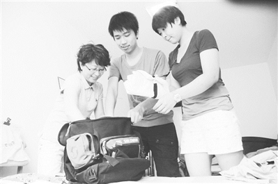 滕大为帮儿子收拾行李。