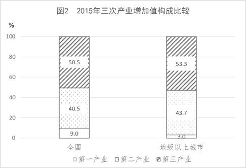 产业结构进一步优化。2015年,地级以上城市第一产业增加值12708亿元,比2012年增加3508亿元,年均增长11.4%;第二产业增加值187526亿元,增加28520亿元,年均增长5.7%;第三产业增加值为228124亿元,增加68949亿元,年均增长12.7%,所占比重由48.6%上升到53.3%,提高了4.7个百分点。第三产业已成为新常态下拉动城市经济增长的主要动力,也成为吸纳劳动力、稳定就业市场的主体。2015年,地级以上城市第一、二、三产业年末单位从业人员分别为55.0万人、5290万人和5499万人,比2012年分别增加2.1万人、908万人和1004万人,年均分别增长1.3%、6.5%和6.9%。