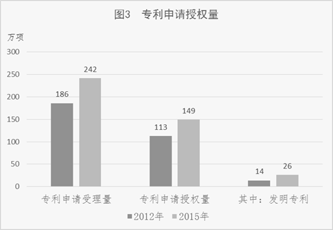 科技实力不断壮大。2015年,地级以上城市科学技术支出2176亿元,比2012年增长53.5%??蒲谐晒崴?,专利申请受理量(全市)242万项,比2012年增长30.3%;专利申请授权量(全市)149万项,增长31.8%。其中,发明26万项,增长86.5%。
