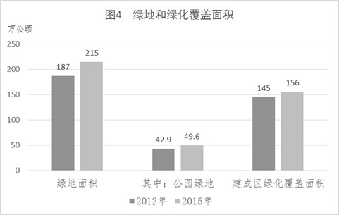 城市人居环境不断改善。党的十八大以来,城市规划和建设把创造优良人居环境作为中心目标,努力提高城市发展的宜居性。按照绿色循环低碳要求,大力开展生态修复,让城市再现绿水青山。2015年,地级以上城市节能环保支出2085亿元,比2012年增长72.5%。工业废水排放量(全市)191亿吨,比2012年下降8.8%;工业二氧化硫排放量(全市)1413万吨,下降17.5%。污水集中处理率(全市)为87.4%,比2012年提高了8.2个百分点。城市建设以自然为美,把好山好水好风光融入城市。2015年末,地级以上城市绿地面积215万公顷,比2012年末增长15.0%。其中,公园绿地面积49.6万公顷,增长15.7%;建成区绿化覆盖面积156万公顷,增长8.0%。