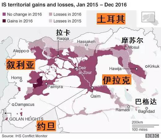 事实上,从2015年起,在各国反恐力量的打击下,IS的“领土”已逐渐缩小。