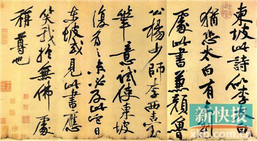 这段文字虽然很短,但却是书法史上非常著名、精彩、重要的评论。因为很精彩,所以经常被引用。尤其是“此书兼颜鲁公(颜真卿)、杨少师(杨凝式)、李西台(李建中)笔意”更是成为后来书法评论的重要“公式”,因为这不但充分显示了评论者的学问,还可以展现被评论者的书学功底,非常有说服力??墒?这样的跋对书法的理解有什么帮助吗?恐怕没有……这样的评论只能说明苏东坡的书法源流,却未能说明苏东坡的书法究竟高明在什么地方……一个人的书法“兼颜鲁公、杨少师、李西台笔意”,就一定好吗?书法风格的创造岂是如此简单的加法?苏东坡的书法中,有什么特色是他迷人的地方?这才是欣赏的重点、评论的要害。但历来的书法评论,却很少做这样的功夫,最重要的原因,在于书法评论没有建立一套放诸四海的标准,于是评论的人只能谈感觉,而欣赏的人只能靠悟性,到最后,欣赏书法就变成各说各话了。