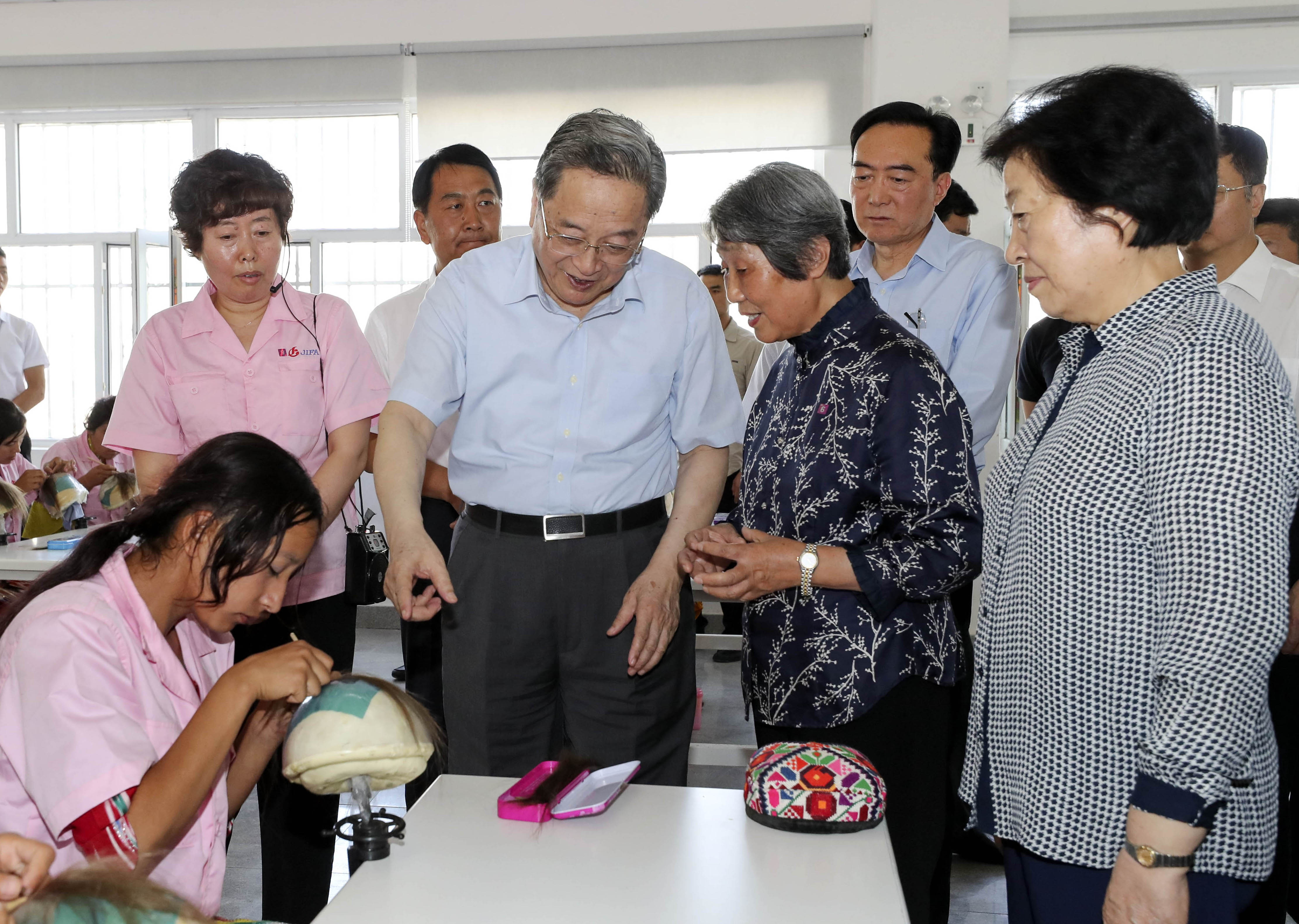 七月九日至十一日,第六次全国对口支援新疆工作会议在新疆喀什召开。中共中央政治局常委、全国政协主席俞正声出席会议并作重要讲话。在喀什期间,俞正声还考察了新疆即发华和服装有限公司、喀什中兴手套有限公司、新疆东纯兴纺织有限公司等企业,并深入便民警务站、幼儿园、民族团结小区进行调研。这是七月九日,俞正声考察新疆即发华和服装有限公司。新华社记者 丁林 摄