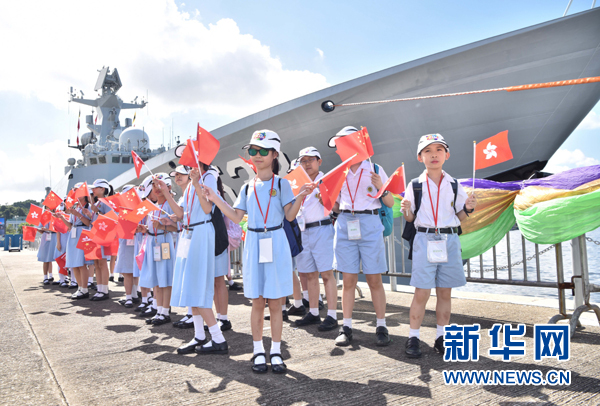 7月11日,孩子们在昂船洲军营欢送辽宁舰编队驶离香港。新华社发(王玺摄)