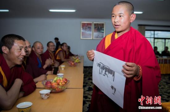 7月10日,西藏佛学院首届少年活佛班7名学员完成三年小学阶段任务,顺利毕业。毕业典礼后西藏佛学院举行首届少年活佛班的小学毕业成果展示活动。图为唐嘉活佛展示藏文书法。中新社记者何蓬磊摄