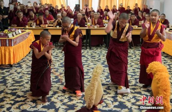 7月10日,西藏佛学院首届少年活佛班7名学员完成三年小学阶段任务,顺利毕业。图为少年活佛学员进行辩经。毕业典礼后西藏佛学院举行首届少年活佛班的小学毕业成果展示活动。中新社记者何蓬磊摄