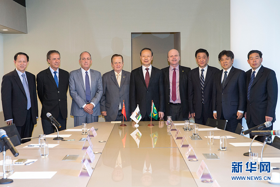 7月11日,在巴西首都巴西利亚,中共中央书记处书记、全国政协副主席杜青林(中)会见巴西民主运动党总书记毛罗·洛佩斯(左四)。新华社记者李明摄