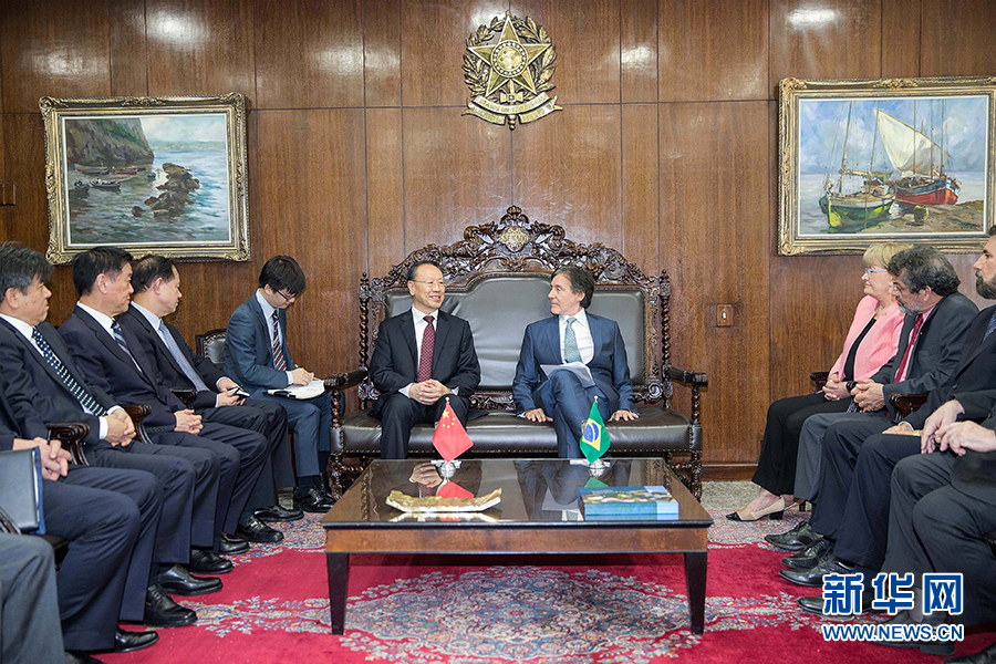 7月11日,在巴西首都巴西利亚,中共中央书记处书记、全国政协副主席杜青林(中左)会见巴西参议院议长欧尼西奥·奥利维拉(中右)。新华社记者李明摄