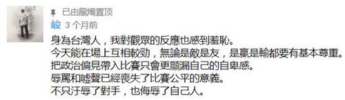 台湾省观众对大陆队员的不尊重是主要原因,有的台湾人也站出来说公道话,然而台主流的媒体报道和网络都是指责大陆队员没有运动风度,在台集体抹黑大陆的舆论环境下,理性的声音很难占到主流。