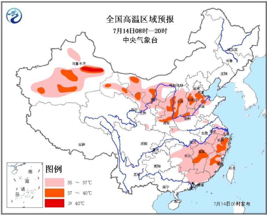 人民网北京7月14日电(冯粒)中央气象台7月14日早晨继续发布高温橙色预警及强对流天气蓝色预警。预计今天白天,内蒙古西部、甘肃、西北地区东部、华北中南部、江南、华南东部、新疆南疆盆地等地有35℃以上的高温天气,其中,河北中南部、山西西部和南部、陕西东北部和关中地区、宁夏北部、甘肃西部、浙江、江西中部及新疆南疆盆地等地的部分地区最高气温可达37~39℃,局地可超过40℃。