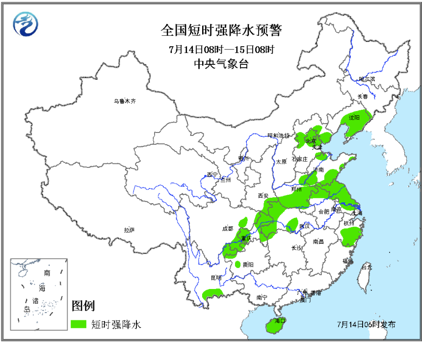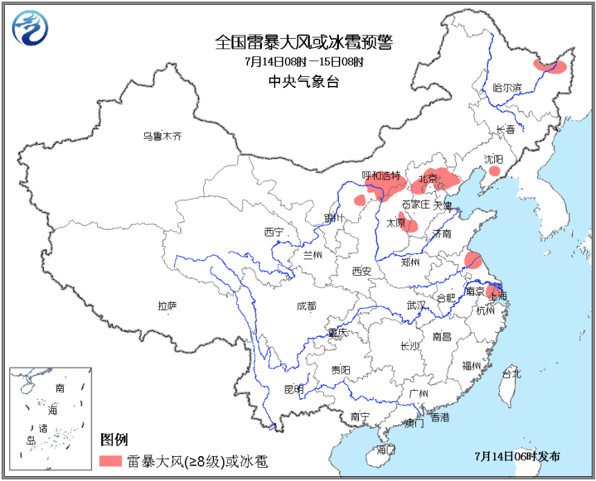 预计7月14日08时至15日08时,黑龙江东北部、辽宁南部、内蒙古中部、山西北部和中东部、河北北部、北京西部和北部、江苏北部和东南部等地的部分地区将有8-9级雷暴大风,局地伴有冰雹天气;另外,辽宁、河北中北部、北京、天津、山东南部、陕西东南部、河南、四川东部、重庆、湖北西部、安徽北部、浙江中南部、云南东北部和南部、海南等地的部分地区将有短时强降水天气,小时雨强20-50毫米,局地可达60毫米以上。