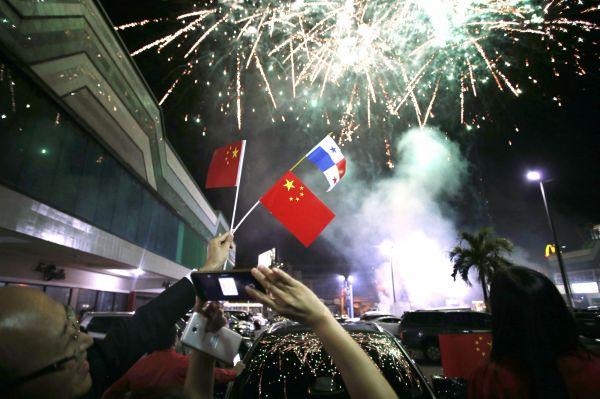 在巴拿马首都巴拿马城的华人社区,人们在巴拿马与中国建交的庆?;疃吓纳阊袒āP禄绶?/p>