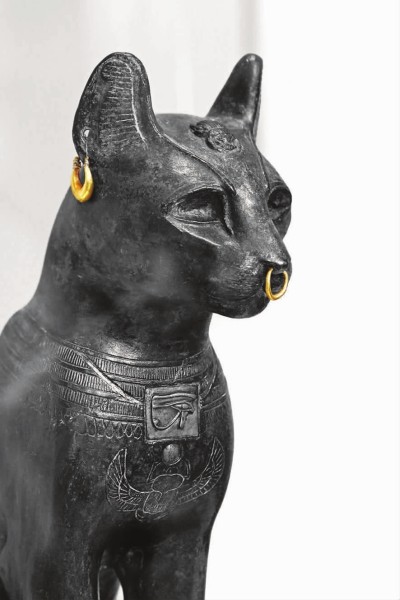 一尊稍显另类的铜制猫神贝斯特雕像,则揭示出古埃及的猫神崇拜。这座雕像以身材苗条高挑的埃及猫为蓝本,坐姿与神情充分体现了猫的本色,笔直坐立,眼神机灵,脖子上佩戴着刻有“荷露斯之眼”的铜饰板,前胸绘有一只头顶日盘展翅欲飞的圣甲虫。公元前2000年的尼罗河三角洲就有猫神崇拜了,人们不仅给猫神贝斯特造像,在猫去世以后也为它们制作木乃伊,这样的“猫乃伊”在大英博物馆同样可以看到。
