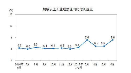 中新网7月17日电 国家统计局今日公布数据,2017年6月份,规模以上工业增加值同比实际增长7.6%(以下增加值增速均为扣除价格因素的实际增长率),比5月份加快1.1个百分点。从环比看,6月份,规模以上工业增加值比上月增长0.81%。1-6月份,规模以上工业增加值同比增长6.9%。