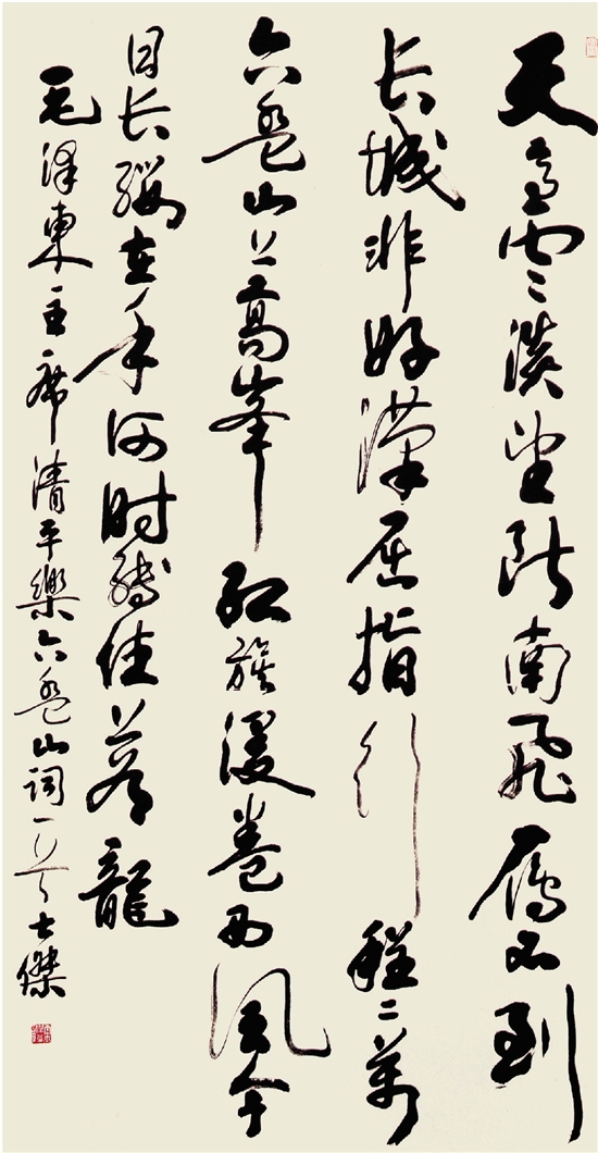 “墨舞初心”是中国书法大厦落成启幕后的第一个以第五、六、七届中国书协理事作主体的书法作品展,作者遍及全国各省市自治区和中国港澳台地区,不乏许多能够自我诗文的著名书法家,真草隶篆行兼备,写意工整并举,大幅巨制争鸣,总计207件,挂满展线长度达300米的展厅,某种侧面反映了当代书坛包容开放的繁荣景象。
