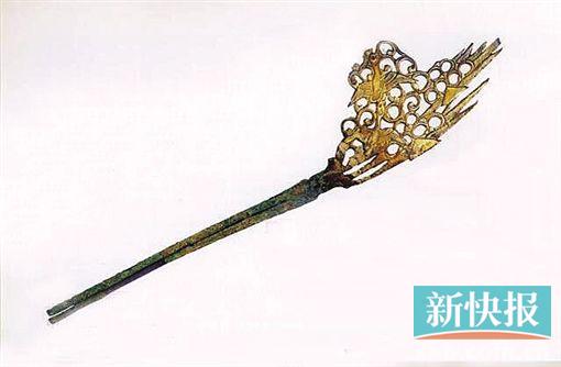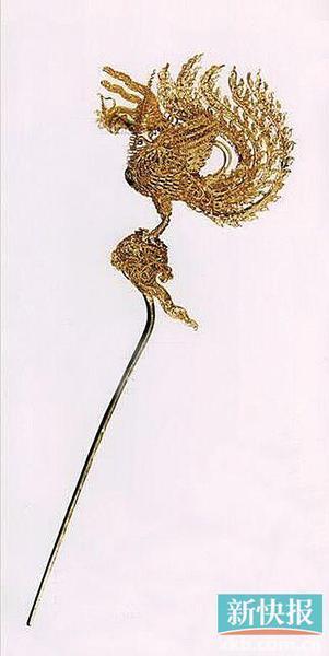 立凤金簪 明 1958年江西省南城县长塘街益庄王墓出土。长22.3厘米,重75.7克。簪头为一立凤,簪柄刻有“银作局永乐二十二年十月内府造九成金二两外焊二分”的铭文。
