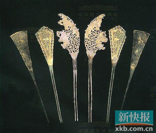 鎏金银簪钗 唐 钗出土于陕西户县(鄠县);簪出土于河南陕县。凤形钗长33厘米,扇形钗长29.6厘米,扇形簪长29厘米。此6件,两股的为钗,有凤形钗和尖头扇形钗各1对,凤形钗图案相同,方向相反;单股的为簪,有平头扇形簪1对。 簪、钗都是约发用具。簪用以固发,源于先秦时期的笄。簪的质地有竹、角、金、银、牙、玉等多种。玉簪又有“搔头”之称,唐李贤墓《观鸟捕蝉图》中,就画有女子正用长簪搔头。簪铤因为是单股,如果顶端太重容易从发上脱落,所以唐代以固髻为主的簪的形式比较简洁,多是和弹琵琶用的拨子相似的扇形簪。钗的形式则多种多样,不仅花饰繁缛,钗头还常悬挂垂饰。唐永泰公主墓和懿德太子墓石椁线刻画中的女侍就有用花形和凤形钗的,她们或插1枚或插2枚,钗头都悬垂饰。唐代后妃、命妇头簪“花树”,实际就是钗头饰有花鸟图案的较大花钗。这种花钗一般一式两件,图案相同,方向相反,以多枚左右对称插戴。按照品级,皇后簪12花树,其他依次递减,也有单数的。
