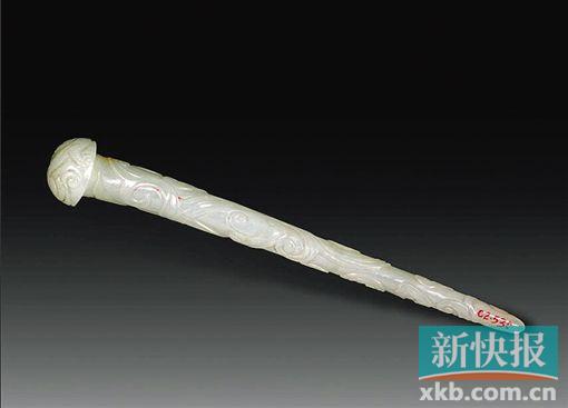 玉云螭纹发簪 明 长10.8厘米。白玉,簪体为圆锥状。一头粗,另一头较细。簪头为蘑菇形,簪尾较尖。头部雕刻螭纹,簪体雕刻云螭纹,上阴刻“子冈”款。螭纹有角,双耳,长发后披,双目直视前方,契形鼻,身体弯卷,长尾。肢胫处刻短斜线纹。采用浅浮雕技法,纹饰精美,线条流畅。做工精细,玉质白润亮泽,为明代玉簪上乘之作。