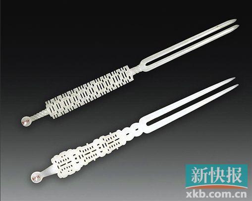 玉镂空喜字簪 清 上:白玉簪:长23.4厘米,最宽2厘米。下:白玉簪:长22.4厘米,最宽2.4厘米。玉簪,一端为耳挖匙状,另一端为双股钗,钗头部很尖锐,中部镂刻喜字文。这两件玉簪原为清宫旧藏。此玉簪造型清代较为常见,是清代贵族妇女头饰用品。玉簪中刻有喜字,应是贵族妇女在结婚等喜庆的时候戴于发髻之上的发饰。