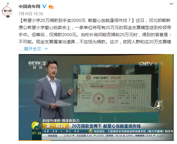 近日,在河北省邯郸新愚公希望小学爱心拍卖会上,某单位当场将明幌幌的写有20万元捐款的现金支票模型送到校领导手中。可事后,仅捐款2000元,只是模型捐款数额的1%。当校长询问能否捐助20万元时,得到的明确答复是:不可能。当事人还振振有词地补充了几句,现金支票属演出道具,不应视为捐款,那只是给台下观众看的。
