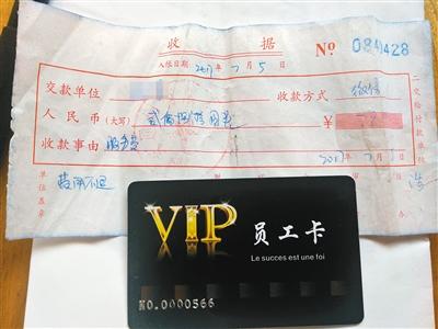 小王向记者展示收费收据和她按照中介机构要求办的员工卡