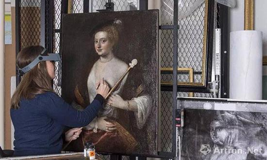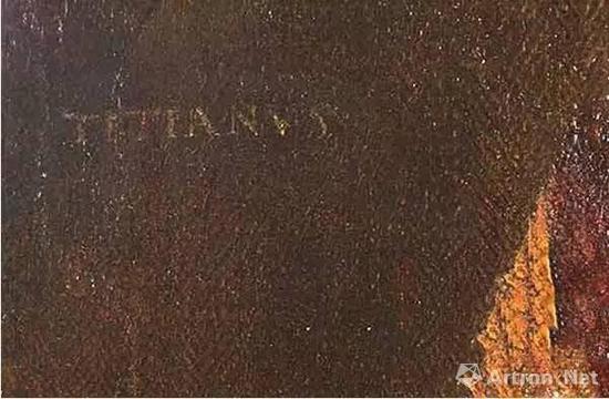 这幅被戏称为《提香的情妇》(Titian‘s Mistress)的作品描绘了一位袒胸露乳,衣着短绸皮袍的富家女子,曾一度被认为是在提香1576年去世多年以后完成的。然而,当艺术品修复师Alice Tate-Harte在清除画作上被后人覆绘的多层涂层时,她发现了明显的署名记号--“TITIANUS”(提香作)。