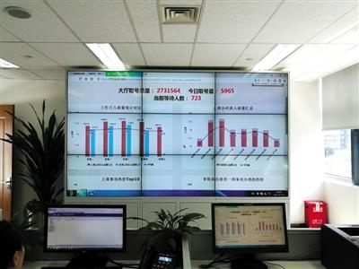 7月6日,成都市武侯区政务中心行政效能监控中心,统计办事人流量情况,包括工作日的人流量和每个工作日各个时段的人流量,群众可以根据监控结果更合理地选择办事时间,提高办事效率。新京报记者 沙璐 摄
