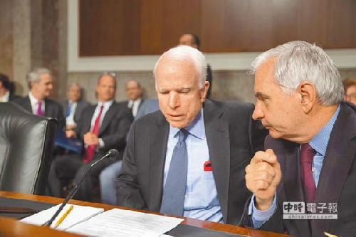 美参院军事委员会主席麦凯恩(左)在讨论法案内容。