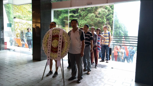 25号上午9点钟,参加活动的民革党员们怀着无比崇敬的心情来到革命陵园,在几名工作人员的协助下,举行了一个庄严而不失隆重的敬献花圈仪式:主委欧阳云和副主委曾学兵把写有民革武汉市洪山区工委的花圈放到纪念碑前,然后带领18名党员肃立在烈士碑前,向烈士们三鞠躬!