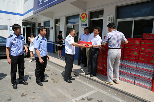 王鸣歧、李荣凯等代表民革山东省委会和省直法律支部为中队同志送上60箱桃、30箱矿泉水以解酷暑。