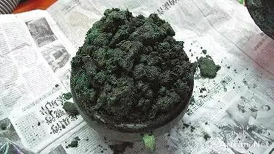 考古人员打开一只生锈的铜敦,发现里面装满了一块块碳化的东西。铜敦是古代的一种食器,由此专家推断里面的碳化物应该是一块块的肉制品。